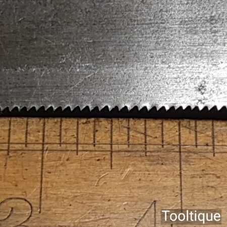The saw has been thoroughly cleaned, jointed, resharpened, and set by hand so that all the hard work of getting an old vintage saw right has been undertaken. We do this so that the next sharpening is easier and no more than a quick freshen up would be required. Those who are familiar with sharpening will know this is no small job and requires skill, effort, and time to achieve good results.