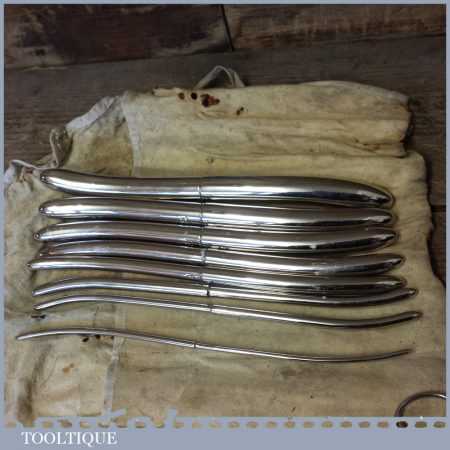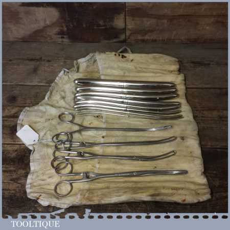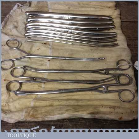 Rare WW2 vintage 12-piece Medical Field Kit by various makers such as Lewis & Down Bros of London Hawkins etc in its original cotton roll.