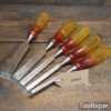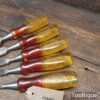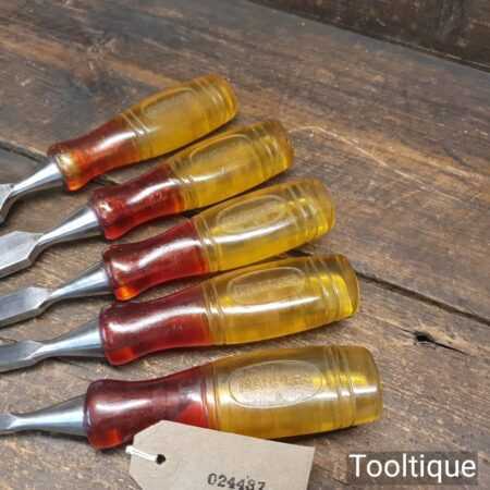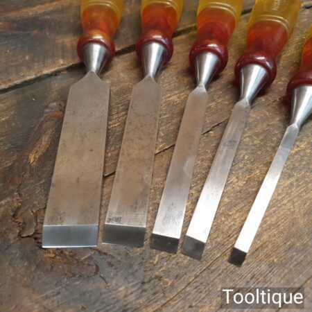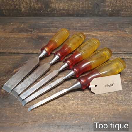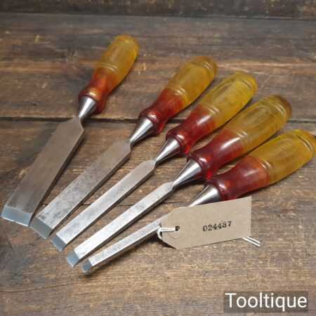 Scarce 5 No: Vintage Marples & Sons Shamrock M373 Firmer chisels (1/4”, 3/8”, 1/2”, 3/4”, 1”) made in Sheffield England with shatterproof handles in good used condition, fully refurbished sharpened and honed ready for use. These firmer chisels are probably the hardest type to find from the Sheffield made M373 range. All refurbished chisels are water cooled during the sharpening & flattening process to ensure the tempering is not affected