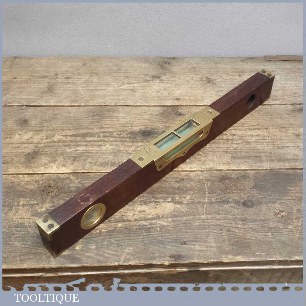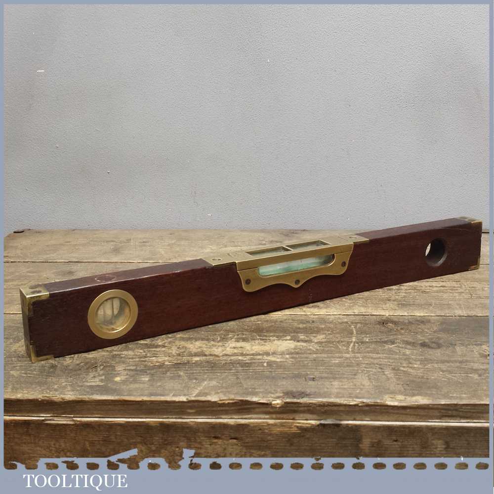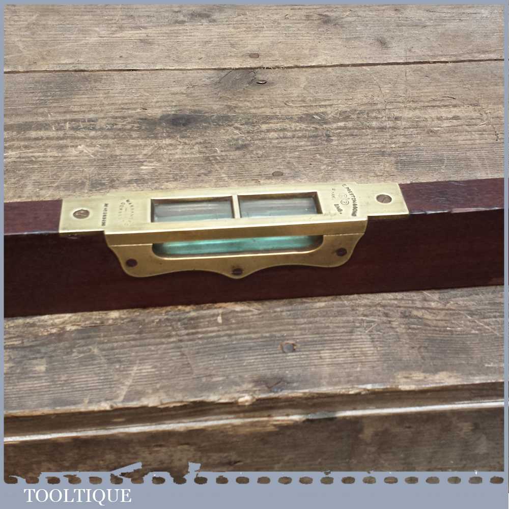 Scarce 18” Edward Preston No: 98 Brass and Mahogany Spirit level in good overall condition. It still has its outer glass and original clear alcohol bubbles although there is a crack in side of the side view glass. Sold as collectable only.