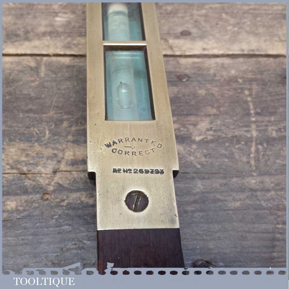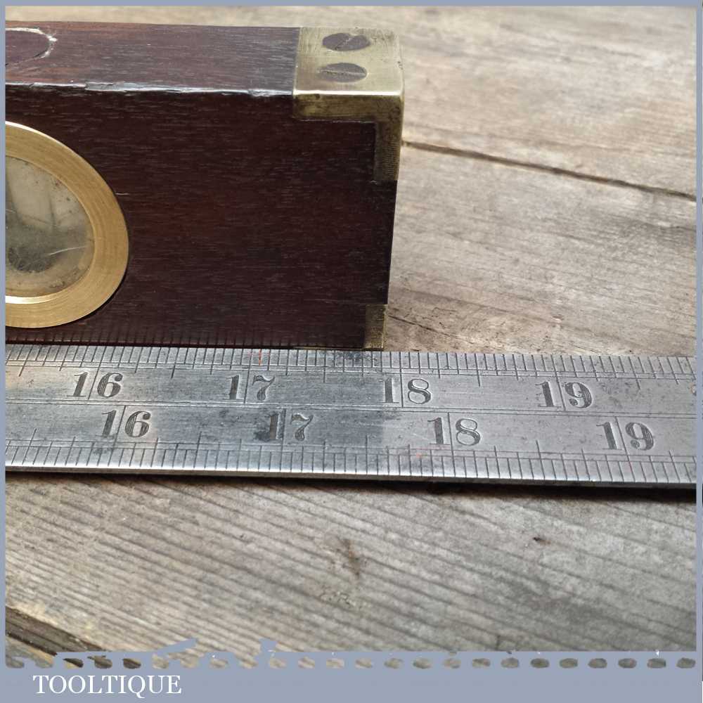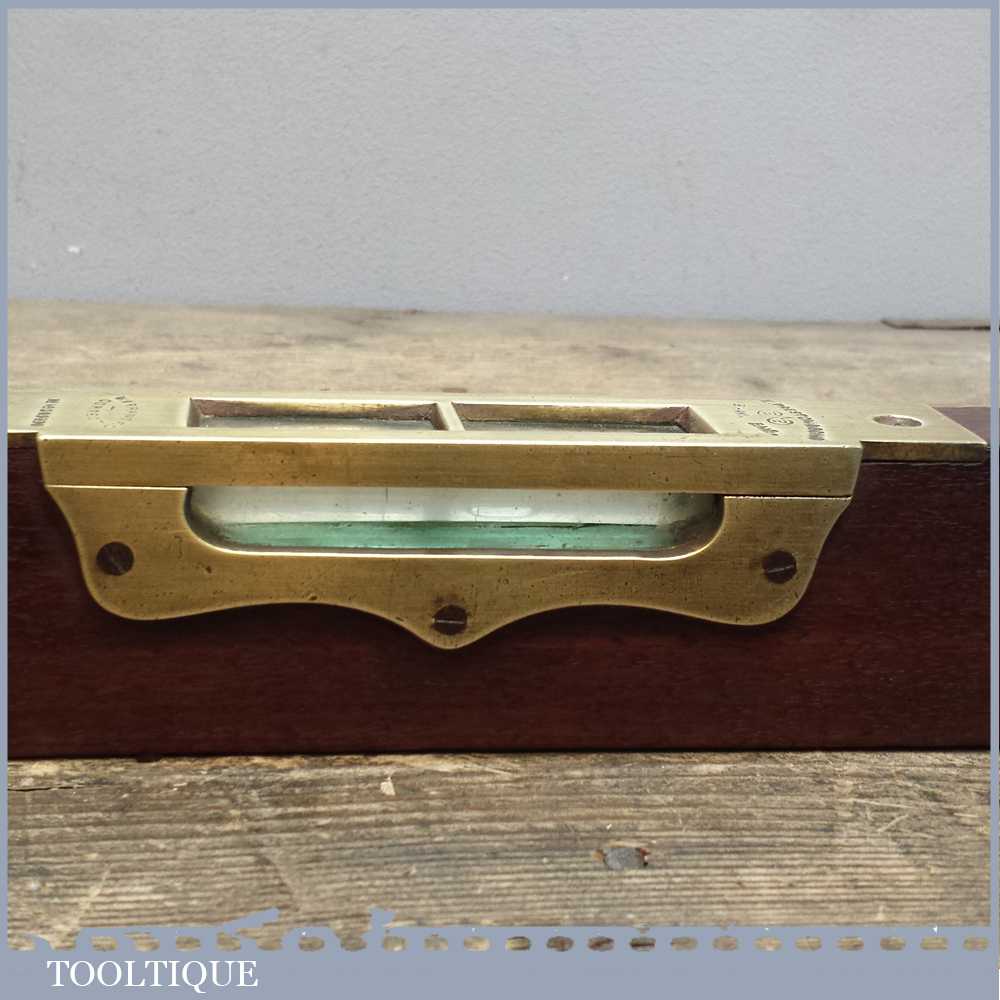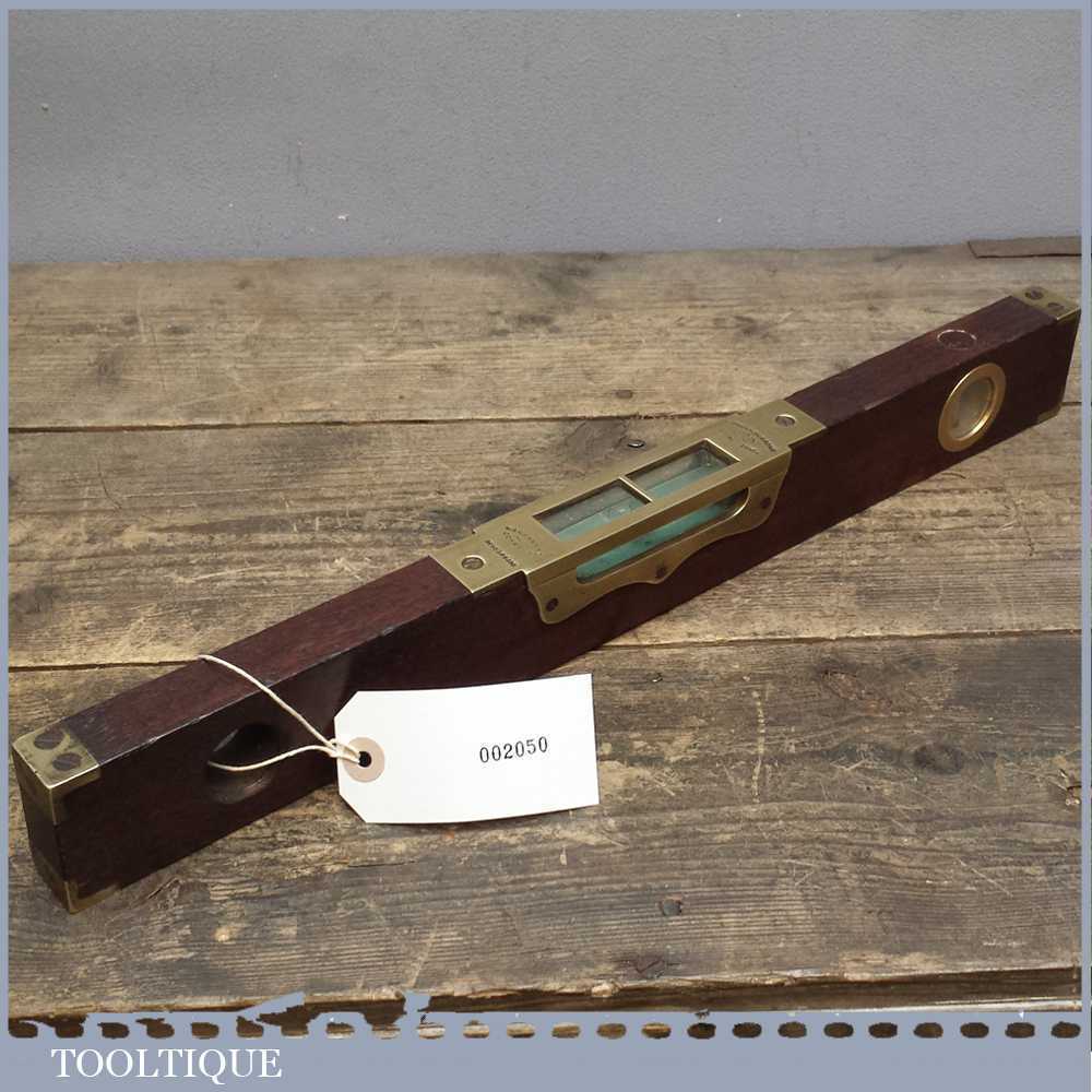 Scarce 18” Edward Preston No: 98 Brass and Mahogany Spirit level in good overall condition. It still has its outer glass and original clear alcohol bubbles although there is a crack in side of the side view glass. Sold as collectable only.