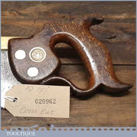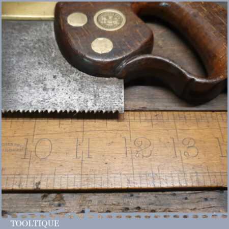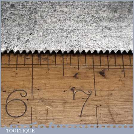 The saw has been thoroughly cleaned, jointed, resharpened and set by hand so that all the hard work of getting an old vintage saw right has been undertaken. We do this so that the next sharpening is easier and no more than a quick freshen up would be required. Those who are familiar with sharpening will know this is no small job and requires skill, effort and time to achieve good results.