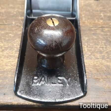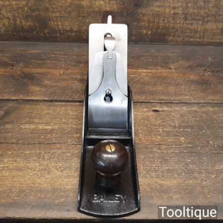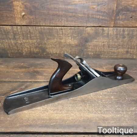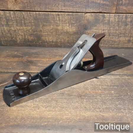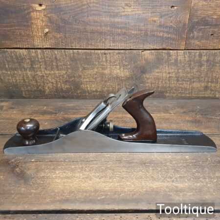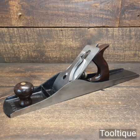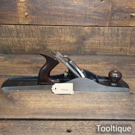 Scarce antique Stanley USA No: 6C corrugated low knob jointer plane Pat dated 1902 with genuine rosewood handles. Upgraded and fitted with a hock Iron and Clifton Stay Set chipbreaker, fully refurbished and in good used condition, ready to use. Note: Pre-frog adjustment type but can be set up for a close fit throat with full support to the iron to further reduce tear-out.