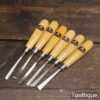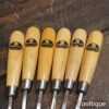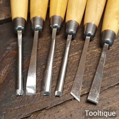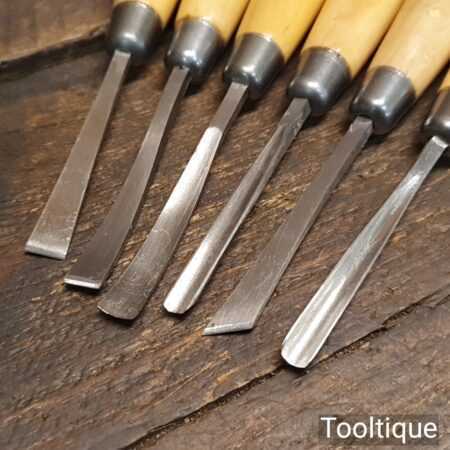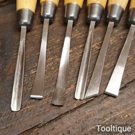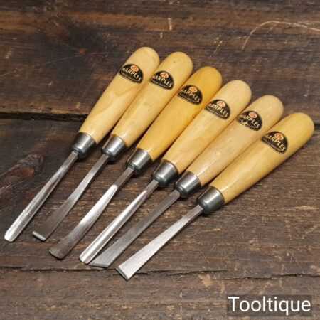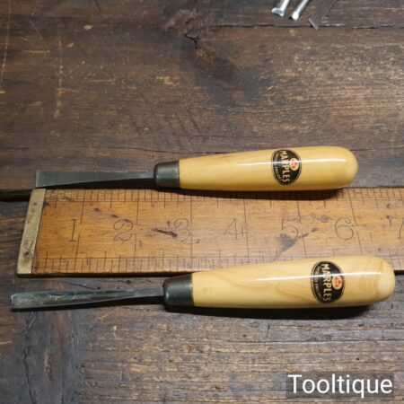 Scarce set of 6 No: vintage W. Marples & Sons wood carving chisels with beechwood handles in good little used condition. All refurbished chisels are water cooled during the sharpening process to ensure the tempering is not affected