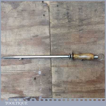 Scarce Vintage Aciem Ltd. butcher’s or chef’s heavy-duty hexagon shaped sharpening steel with beechwood handle, in good used condition.