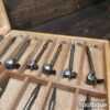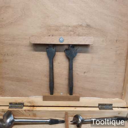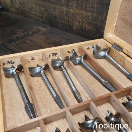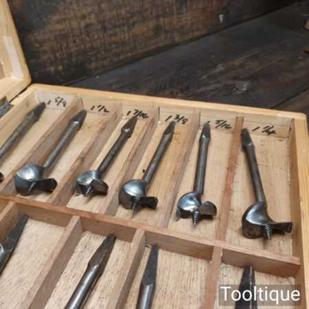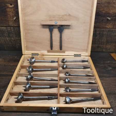 Scarce vintage set of 11 centre bits larger 1” – 2 ¼” sized in a wooden box, sharpened ready for use and in good used condition. Note: Mixed makers.