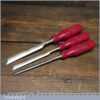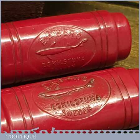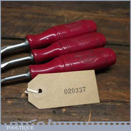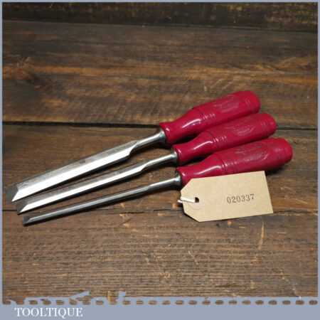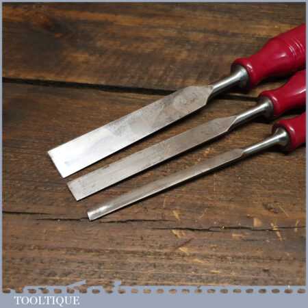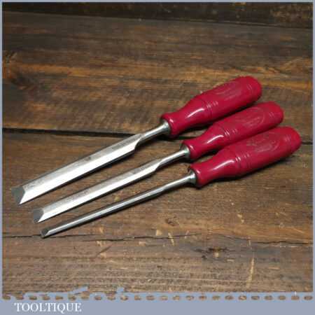 Scarce vintage set of 3 No: Erik Anton Berg, Sweden carpenter’s bevel edge chisels (1/4”, 1/2” & 3/4”) with shatterproof handles in good used condition, fully refurbished sharpened and honed ready for use.