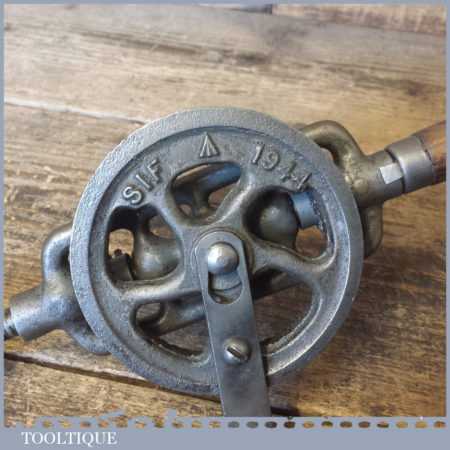 Scarce vintage SIF (Suffolk Iron Foundry) egg beater double pinion hand drill stamped with crowsfoot broad arrow and dated 1944, in good used condition and ready for use
