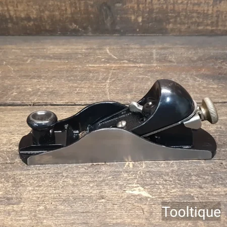 Semi Modern Stanley No: 220 Block Plane with Screw Adjustment, refurbished ready for use and in good used condition. When refurbishing planes, we do not merely clean them to make them look good, they are restored to a level that ensures this plane is actually ‘in plane to within 0.01mm’ sharpened, honed and all the components are thoroughly cleaned so that they move freely. Our planes are specifically reconditioned to satisfy professional tradesmen who will instantly know the difference between buying one of our planes over general other used ones.