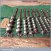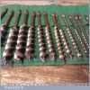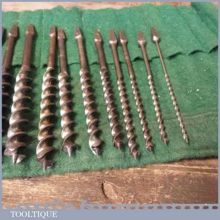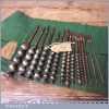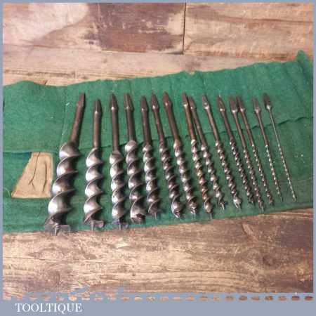 Vintage set of 15 No: double spur screw auger bits by various makers ranging between 1/8” – 1 ¼” in a baize roll, in good used condition.