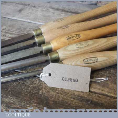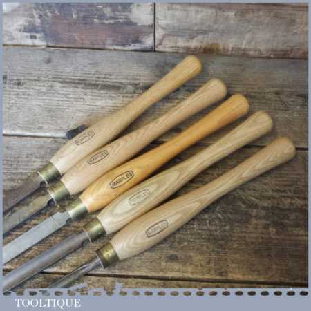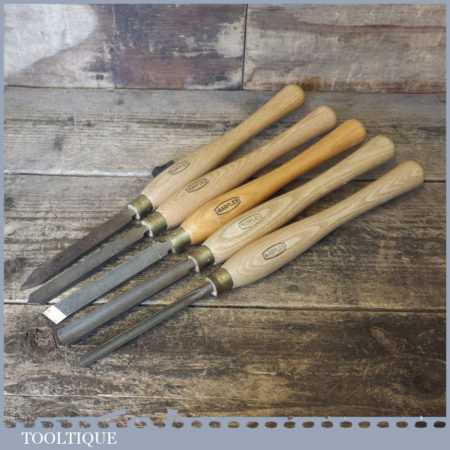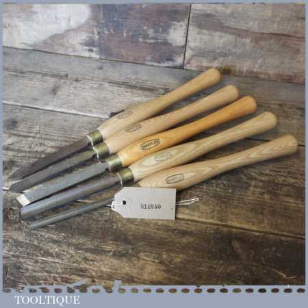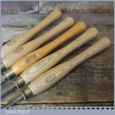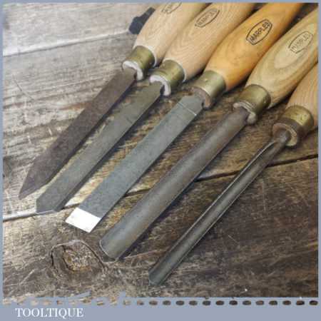 Set of 5 No: Marples vintage wood turning chisels with beechwood handles in good used condition.