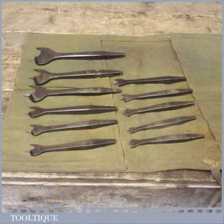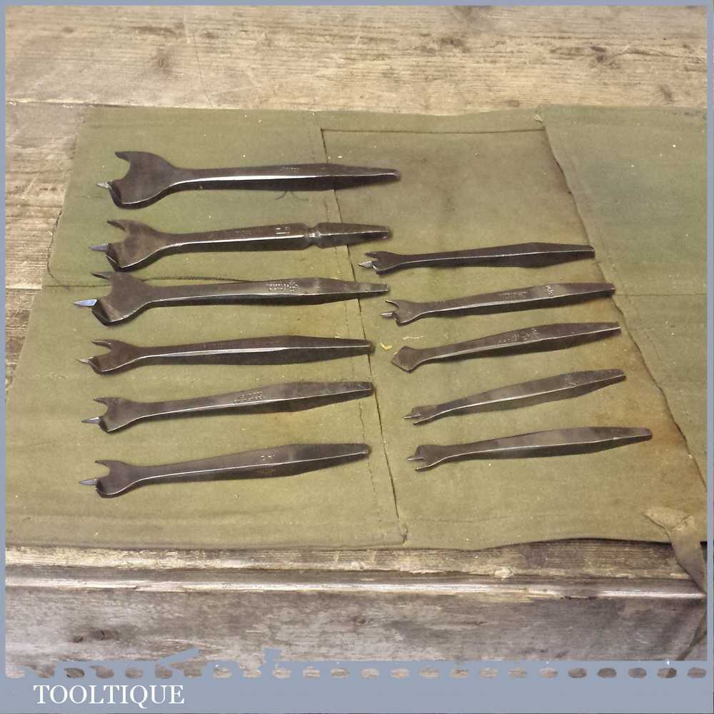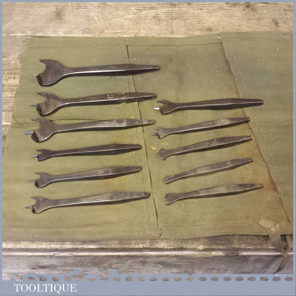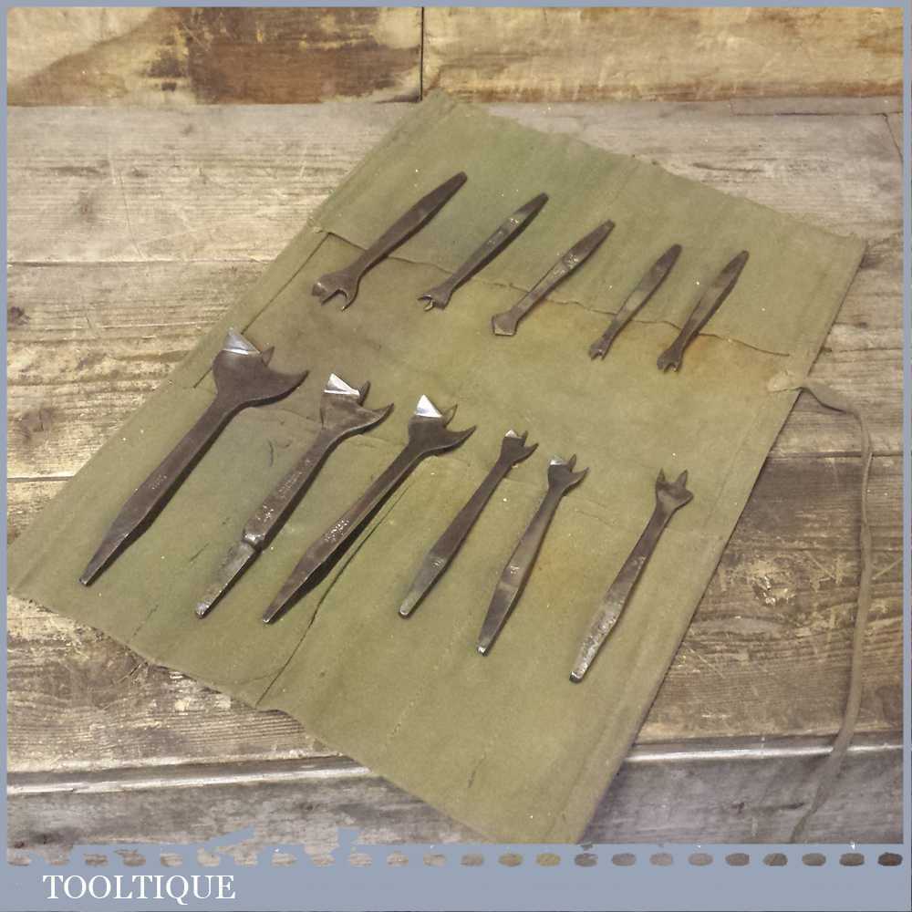 Set of 11 graduated sized woodworking bits for a brace in a canvass roll.
