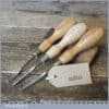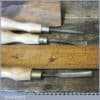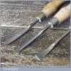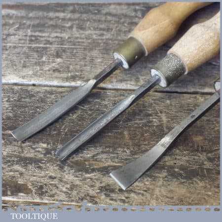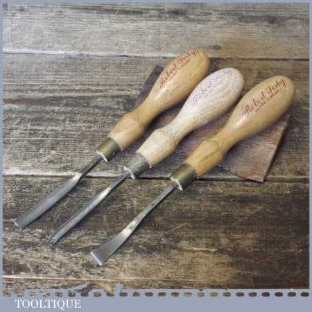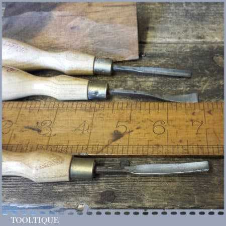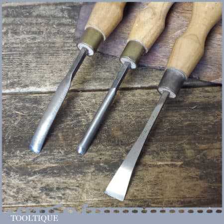 Set of 3 No: Robert Sorby wood carving chisels with ash handles in good used condition, fully refurbished sharpened and honed ready for use.