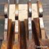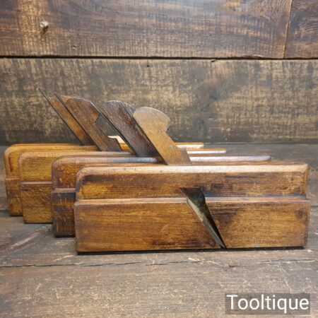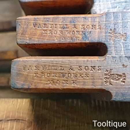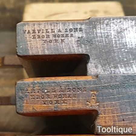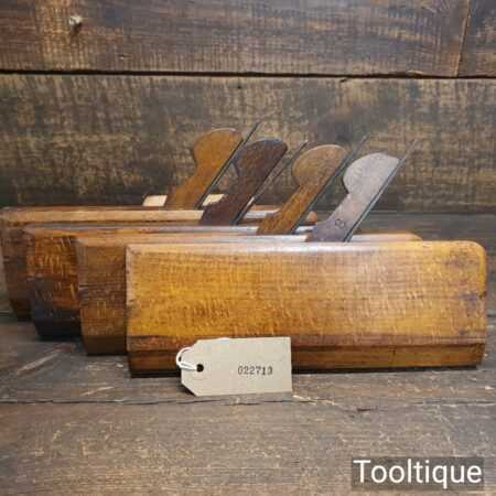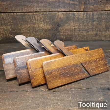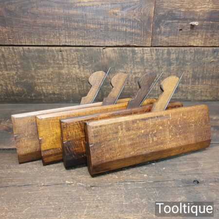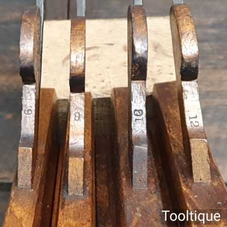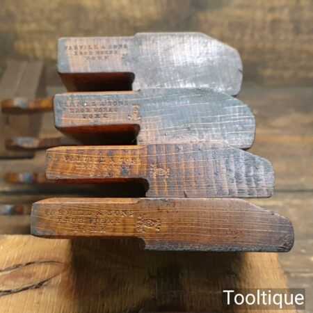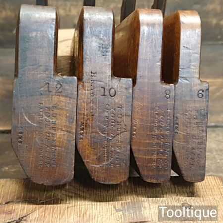 Set of 4 No: antique Varvill & Sons round beechwood moulding planes (No’s 6, 8, 10 & 12) in good used condition. I also like the detail where the wedges have been stamped to show the size.