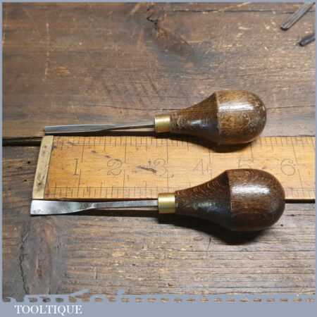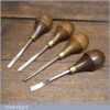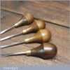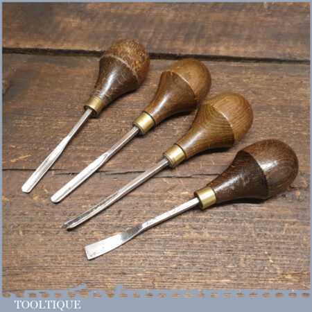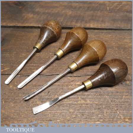 Set of 4 No: vintage woodcarving palm chisels with beechwood handles in good used condition, fully refurbished sharpened and honed ready for use. These chisels have been checked to ensure the tangs are seated properly and the handles are solid and fit for use. All refurbished chisels are water cooled during the sharpening process to ensure the tempering is not affected.