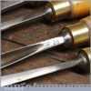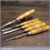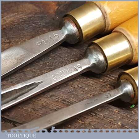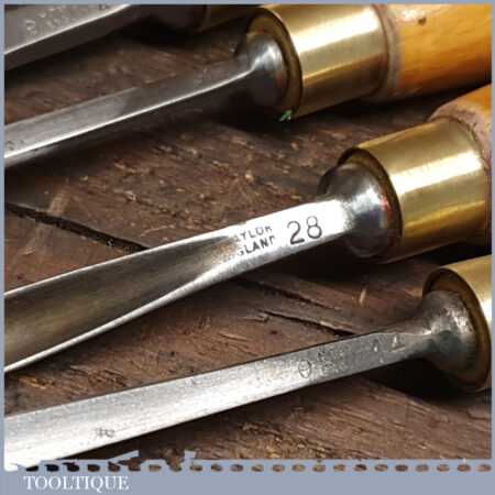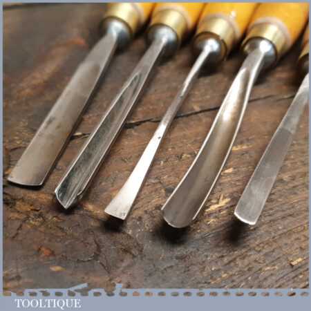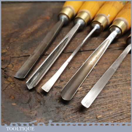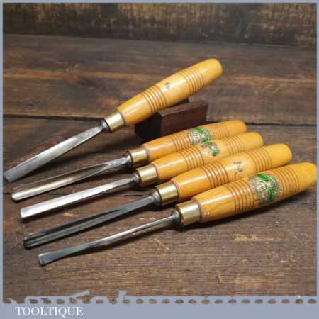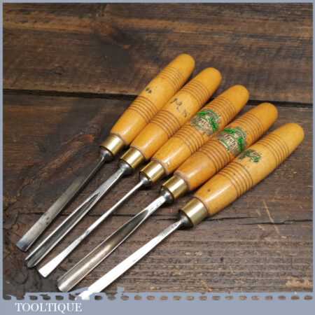 Set of 5 No: vintage Henry Taylor woodcarving chisels with beechwood handles in good used condition, fully refurbished sharpened and honed ready for use.