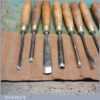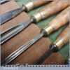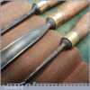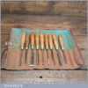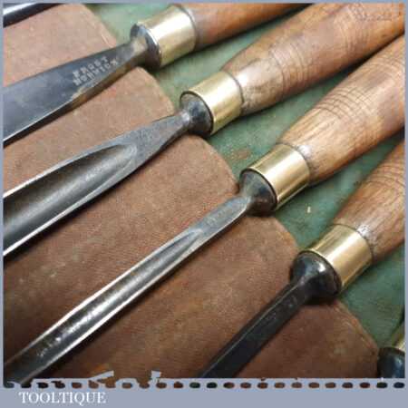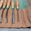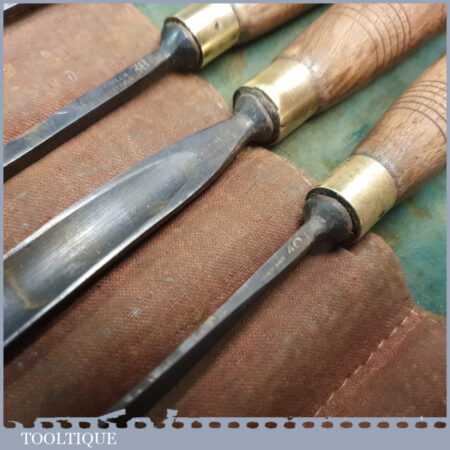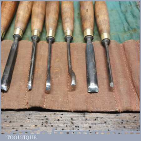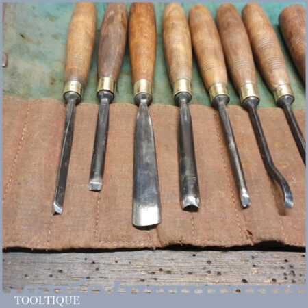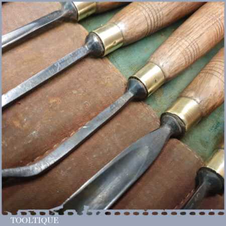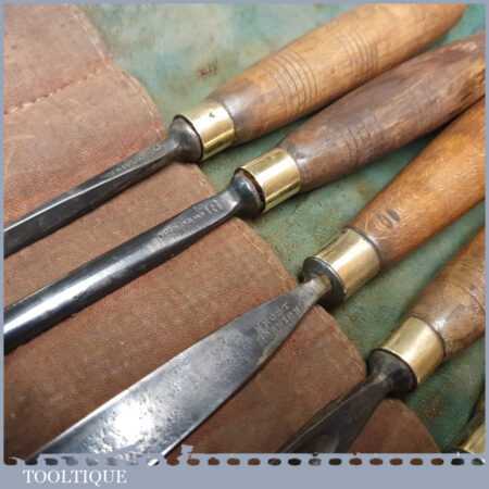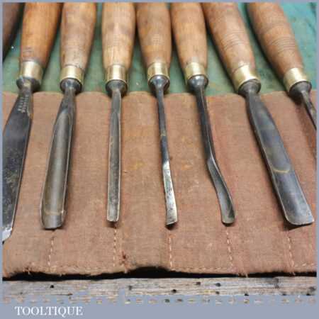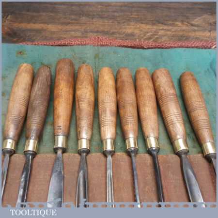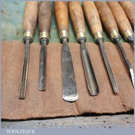 Set of 9 No: vintage woodcarving chisels with beechwood handles in a canvas roll and in fair used condition, fully refurbished sharpened and honed ready for use.