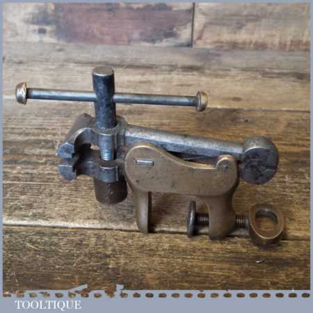 Small antique jewellers portable bench vice with brass body clamp in good used condition. This is an interesting tool, possibly craftsman modified or original but hard to tell given it is so unique.