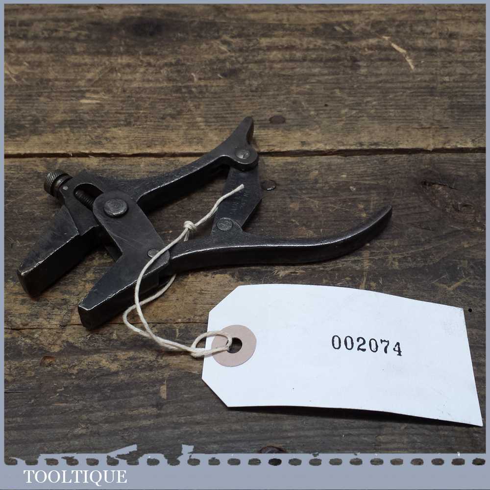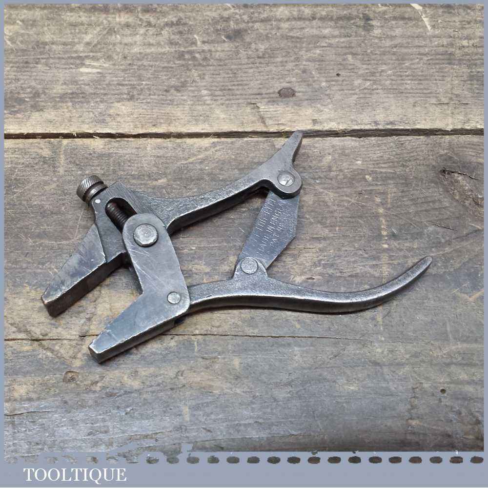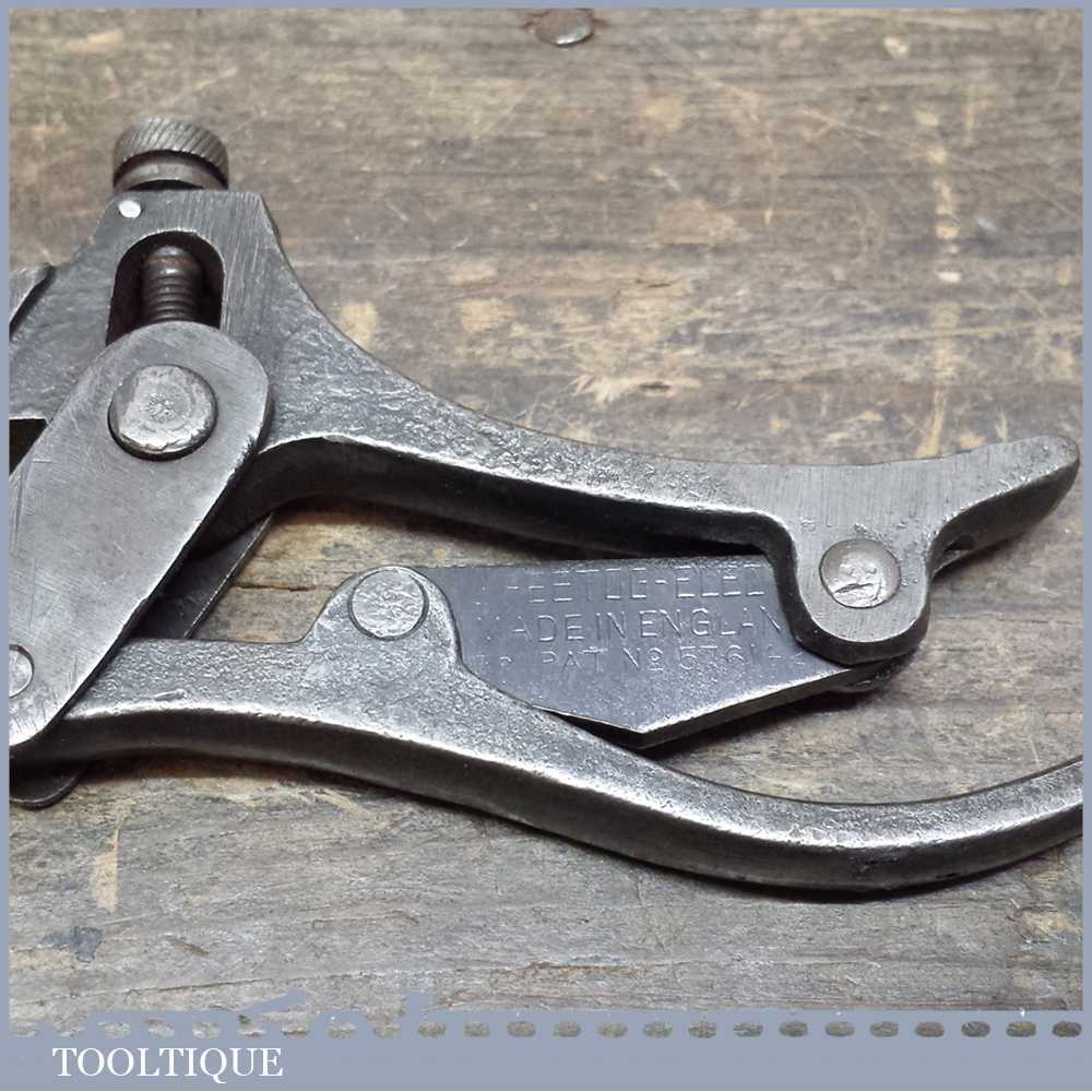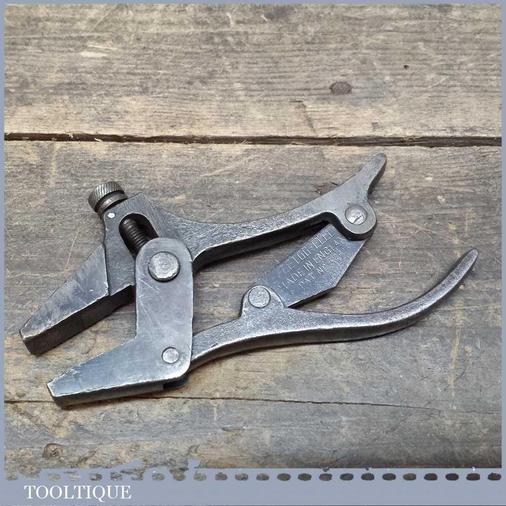 SPEETOG PLIER CLAMP – Made In England UK Pat. No. 576142 brilliant little Plier clamp tool with a screw adjustable top jaw. Screw adjustment to set jaw width. The jaws remain parallel. An “L” shaped pivoted piece at the end of the movable handle is the release. Patented by Edgar Dale Ball of Derby County, Great Britain on Mar. 20 in 1946.