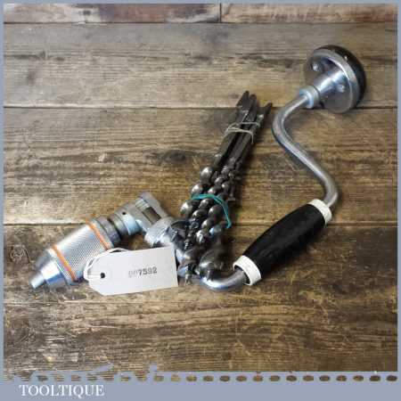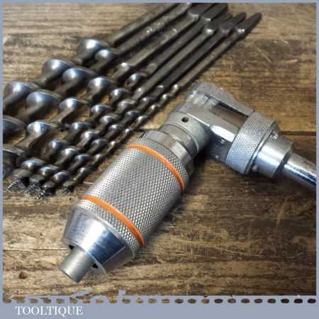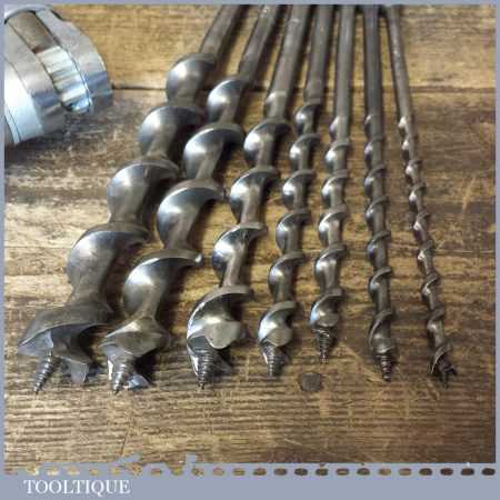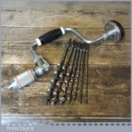 Stanley No: 73 Brace with an 8” swing and set 7 No: bits by various makers (mostly Ridgeway) in good working order and ready for use.
