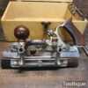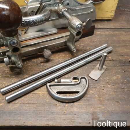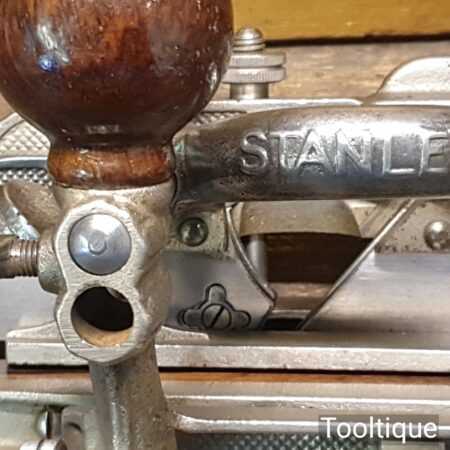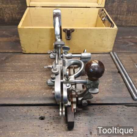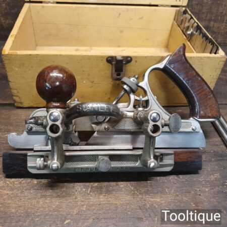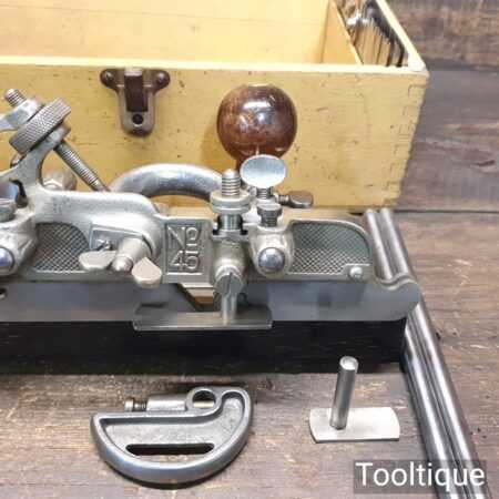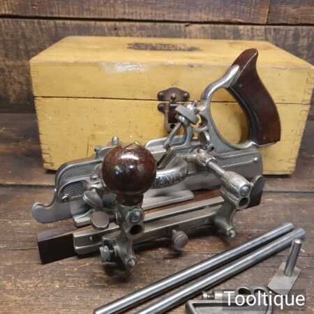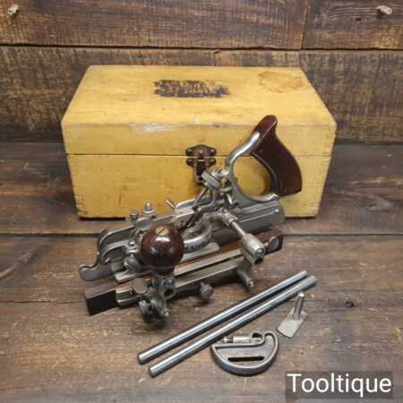 Superb vintage Stanley Sweetheart. USA No: 45 combination plough plane, complete with a full set of cutters and in original wooden box. The plane is in good condition and all components move smoothly. Note: We do not sharpen the irons. Note: I cannot stress the importance of buying these planes complete with the correct screws etc.