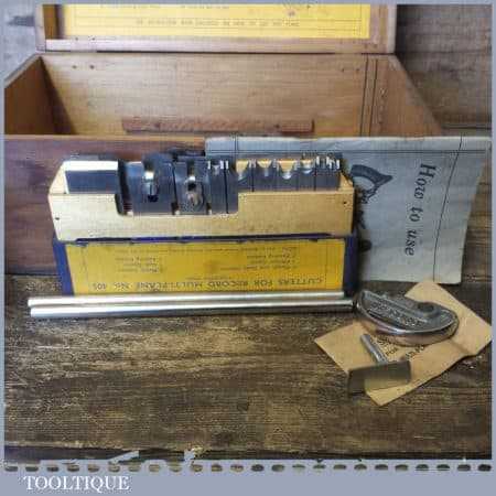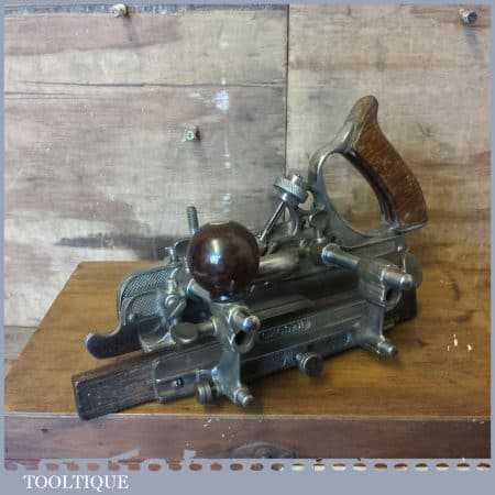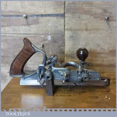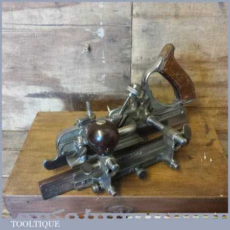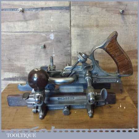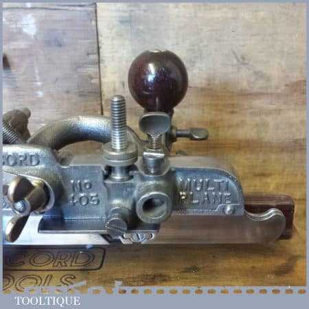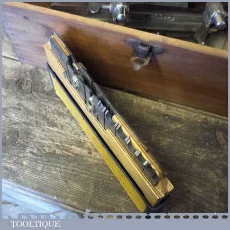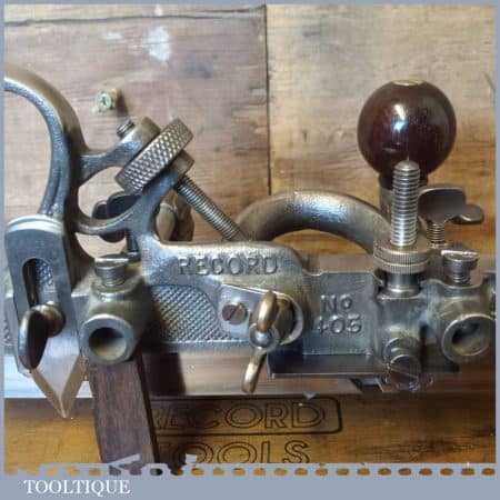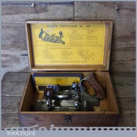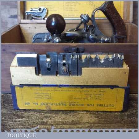 Superb vintage boxed Record No: 405 combination plough plane complete with cutters. The plane is in excellent condition and all components move smoothly, it’s also the earlier version with rosewood handles. Note: We do not sharpen the irons.