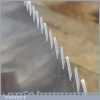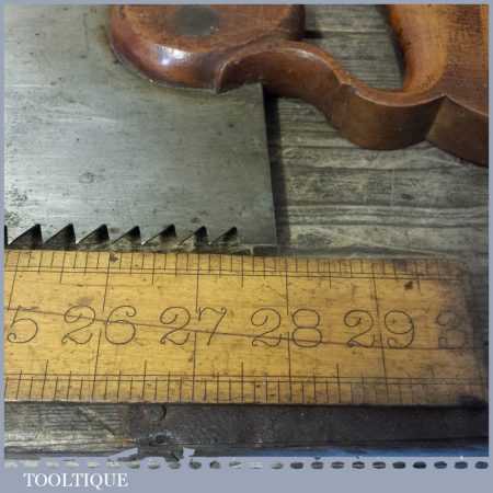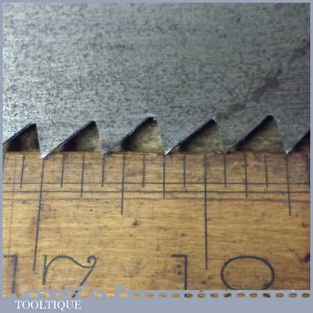 The saw has been thoroughly cleaned, jointed, resharpened and set by hand so that all the hard work of getting an old vintage saw right has been undertaken. We do this so that the next sharpening is easier and no more than a quick freshen up would be required. Those who are familiar with sharpening will know this is no small job and requires skill, effort and time to achieve good results.