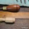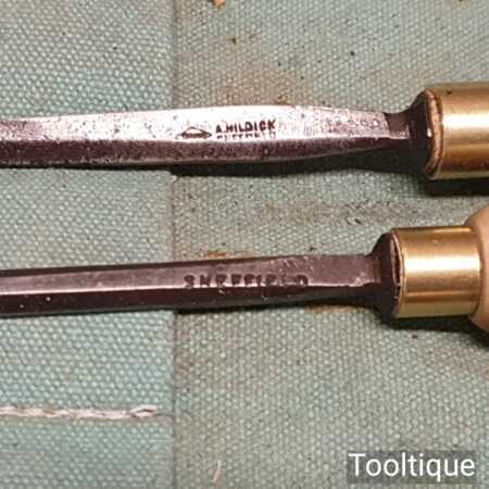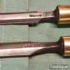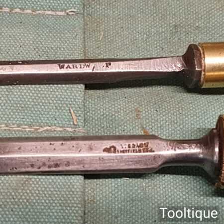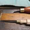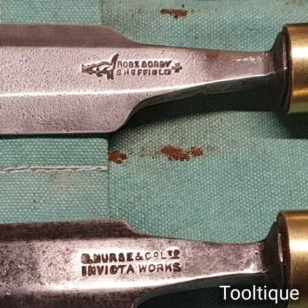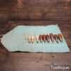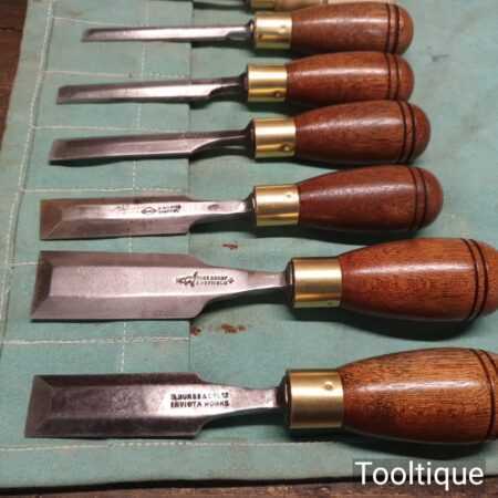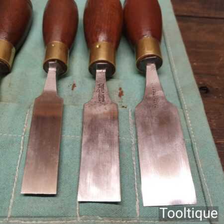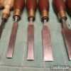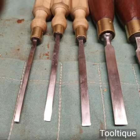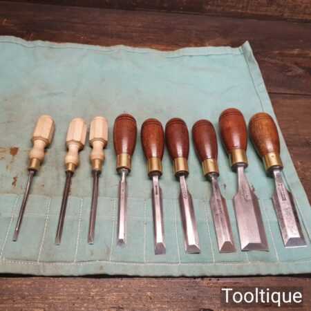 Superb vintage set of 9 No: bevel edge palm chisels in canvass roll by various makers with sizes ranging between 1/8” – 1 ¼” in good used condition, fully refurbished sharpened and honed ready for use. Note: Fitted with Hard Maple and Mahogany handles. All refurbished chisels are water cooled during the sharpening and flattening process to ensure the tempering is not affected