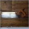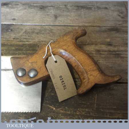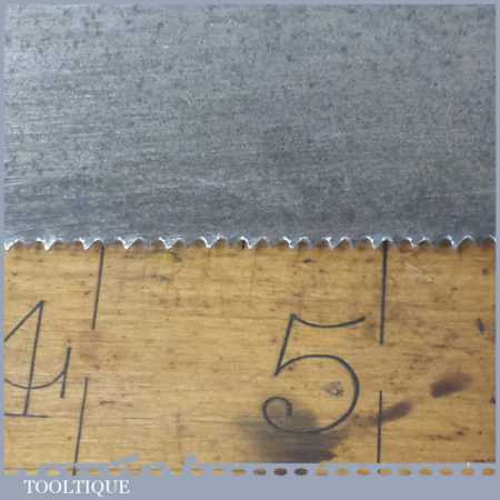 The saw has been thoroughly cleaned including under the handle, jointed, resharpened and set by hand so that all the hard work of getting an old vintage saw right has been undertaken. We do this so that the next sharpening is easier and no more than a quick freshen up would be required. Those who are familiar with sharpening will know this is no small job and requires skill, effort and time to achieve good results.