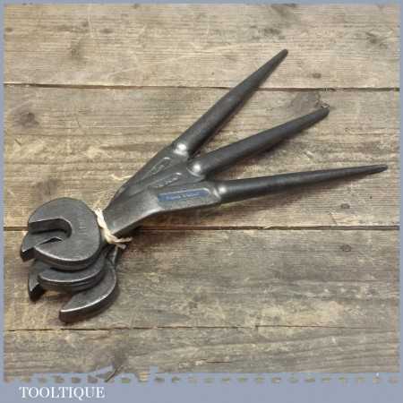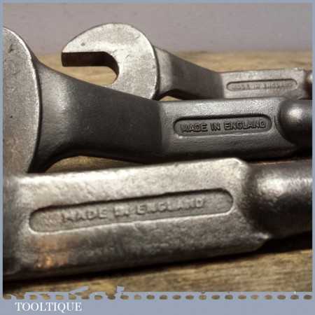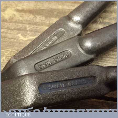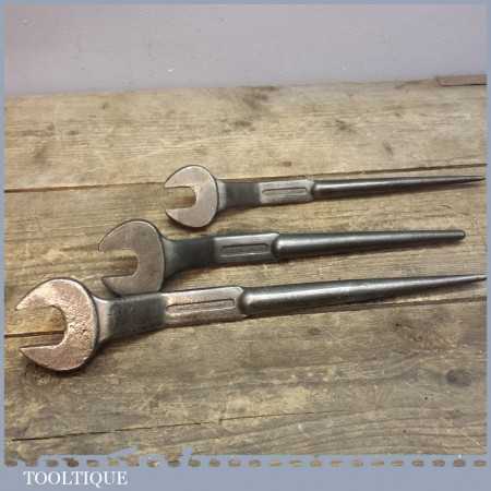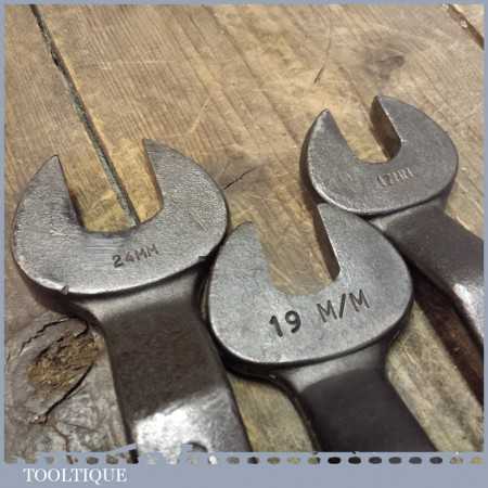 Three Vintage Snail Brand (Made in England) Steel erectors podgers in good used condition. There are three sizes commonly used today 17mm 19mm and 24mm. These are high quality spanners at a fraction of the cost the same equivalent would cost today. I was a steel erector for a number of years and these outlasted my time in the trade.