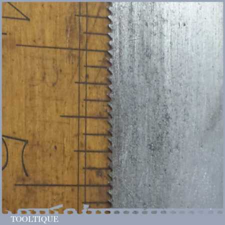 The saw has been thoroughly cleaned including under the handle, jointed, resharpened and set by hand so that all the hard work of getting an old vintage saw right has been undertaken. We do this so that the next sharpening is easier and no more than a quick freshen up would be required. Those who are familiar with sharpening will know this is no small job and requires skill, effort and time to achieve good results.