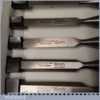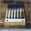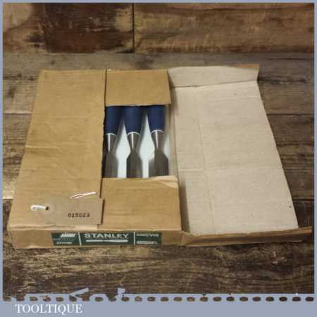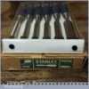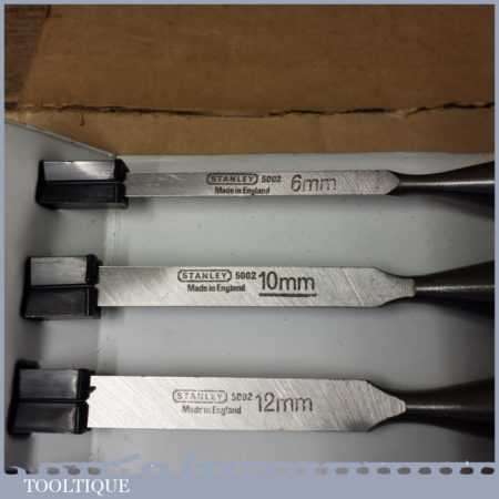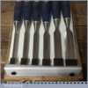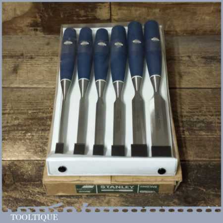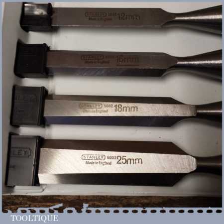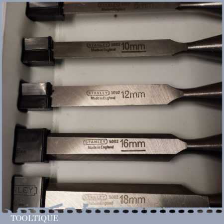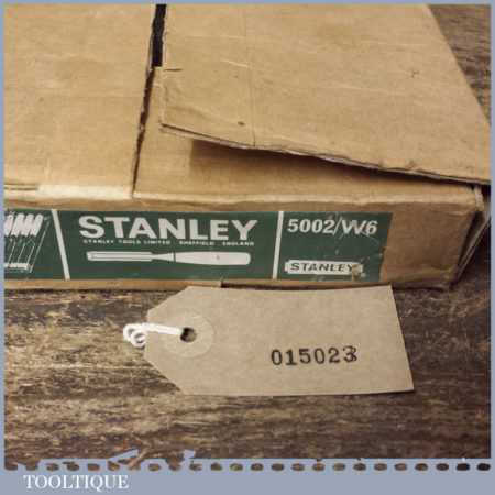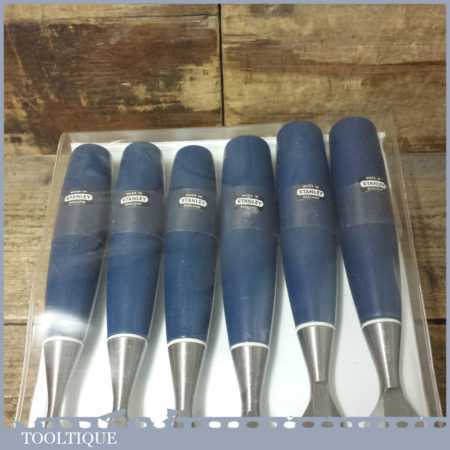 Unused Boxed set of 6 No: Stanley 5002 carpenter’s bevel edge chisels with plastic handles in good used condition, fully refurbished sharpened and honed ready for use. These are approx 30 years old.
