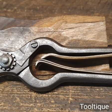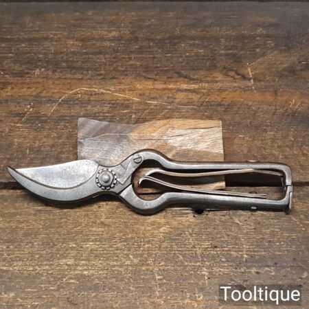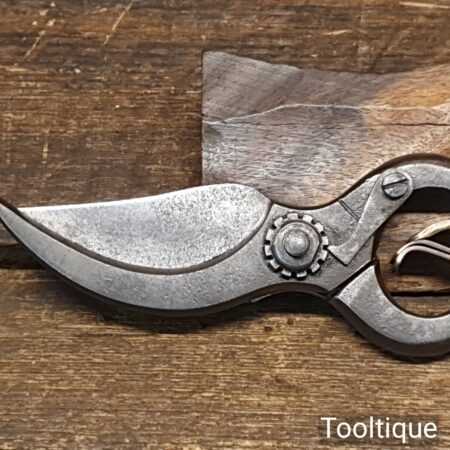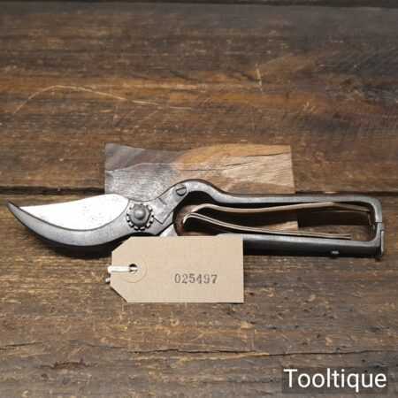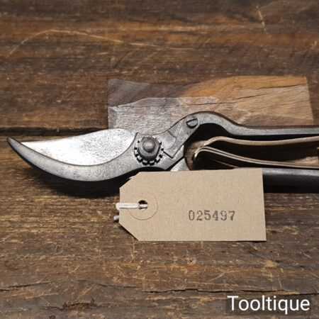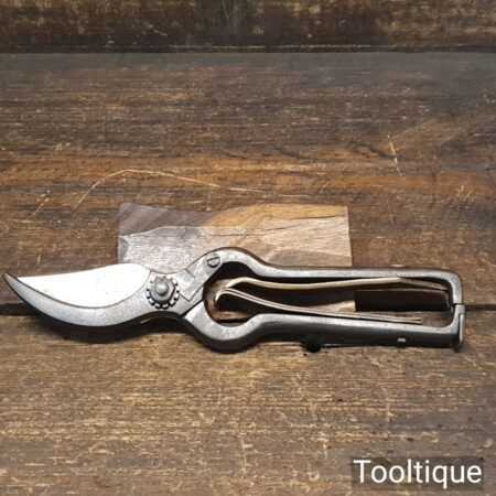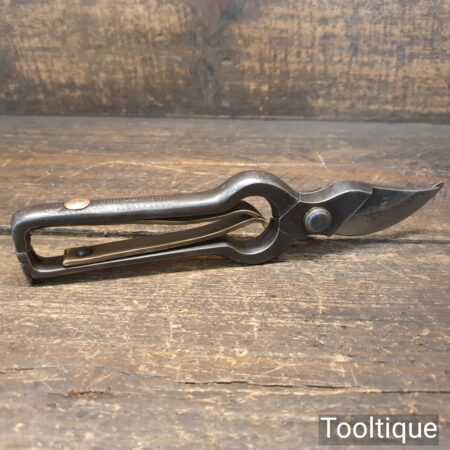 Unusual A1 secateurs with cast steel and clever brass opening spring system, in very good condition. Other refined details include locking nut with a pivoting lever. Tested and cut well.