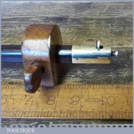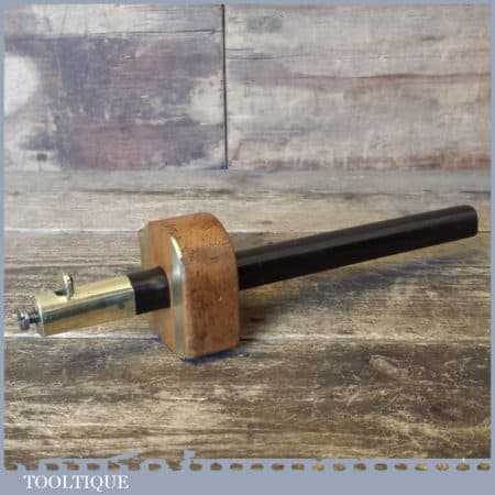 Unusual Antique cutting gauge with beechwood and brass body, boxwood screw and ebony and brass stem, in good used condition.