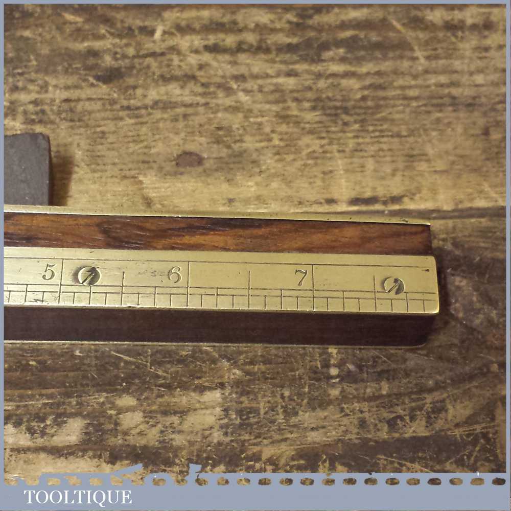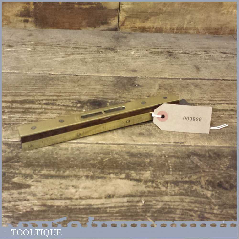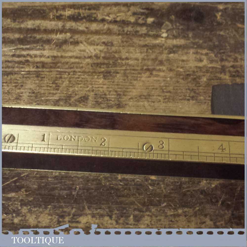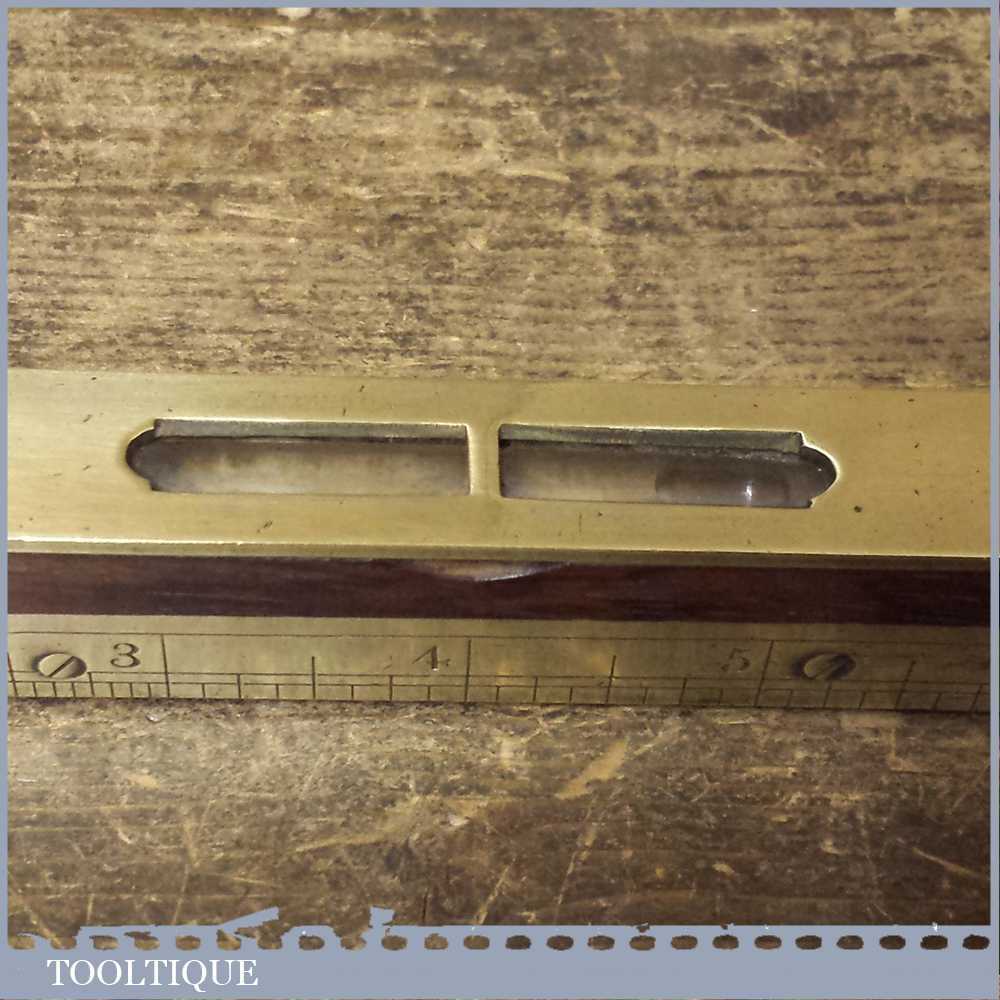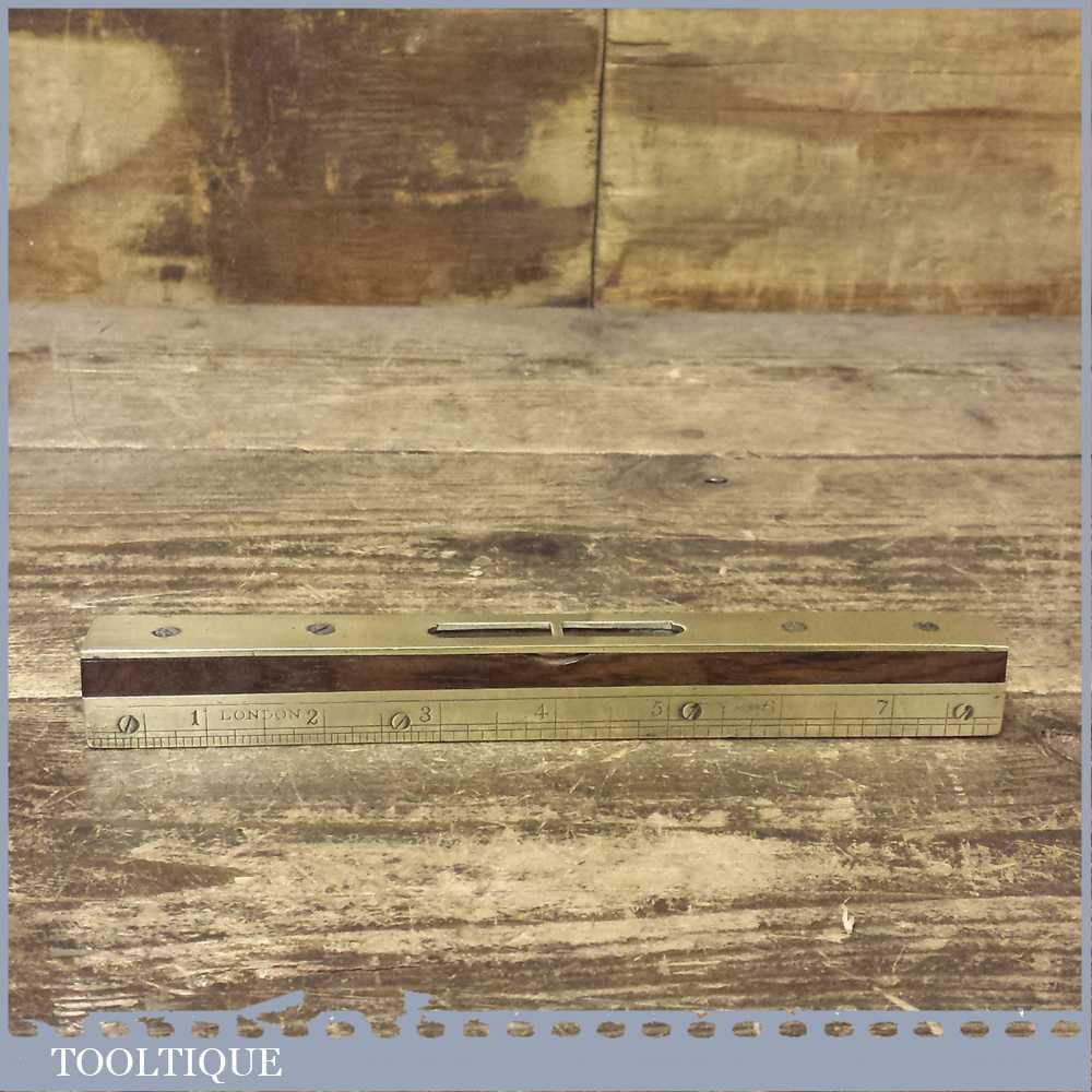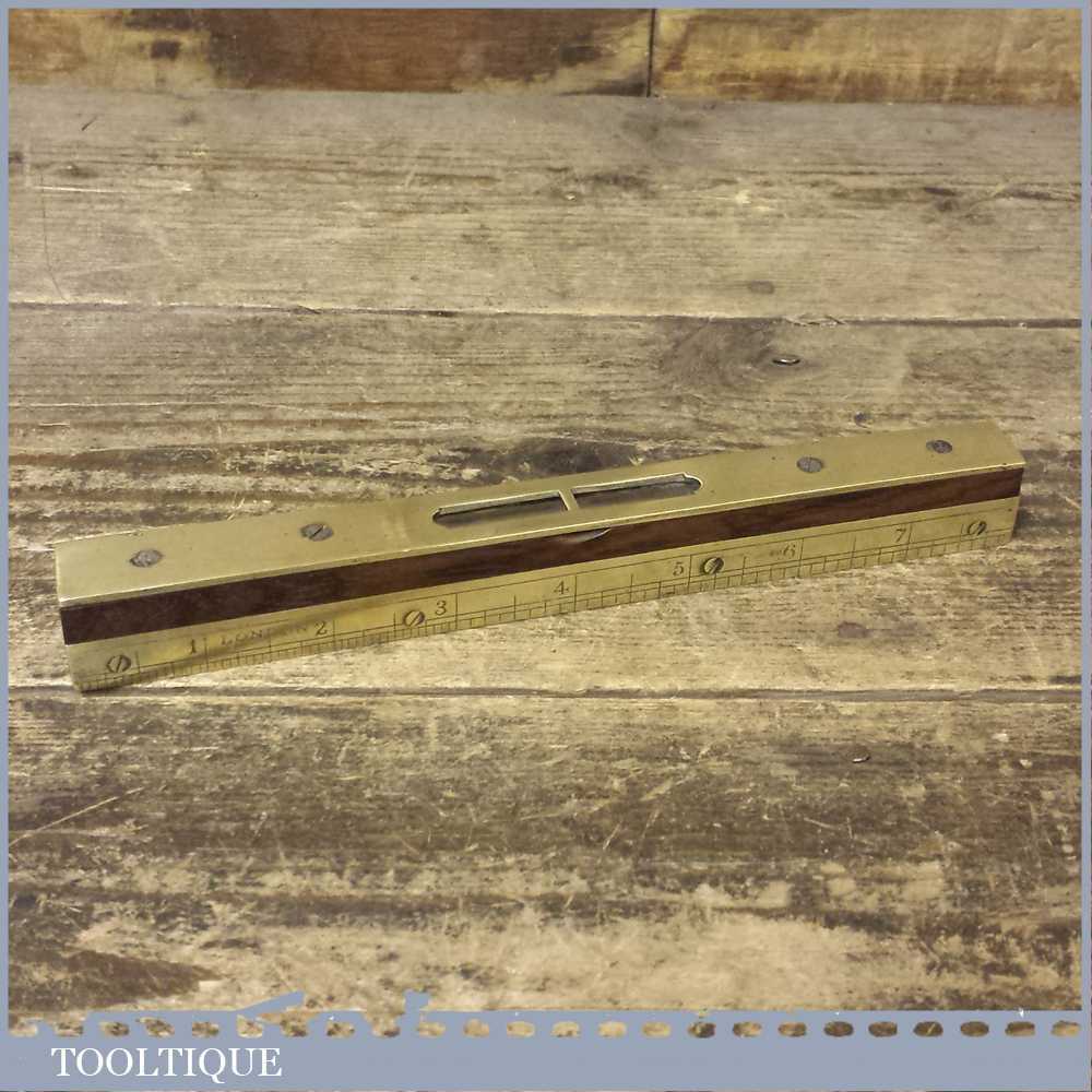 Unusual & rare 8” vintage Rosewood & brass level with inset rulers to each side stamped London. The level has a good clear bubble and is in good condition. I have never seen one like this before and the London stamp could well be a maker rather than the area.