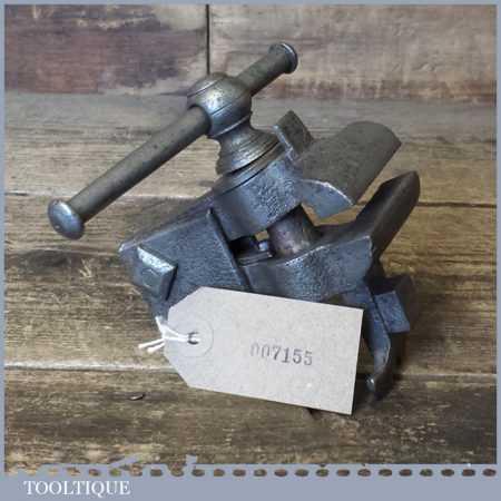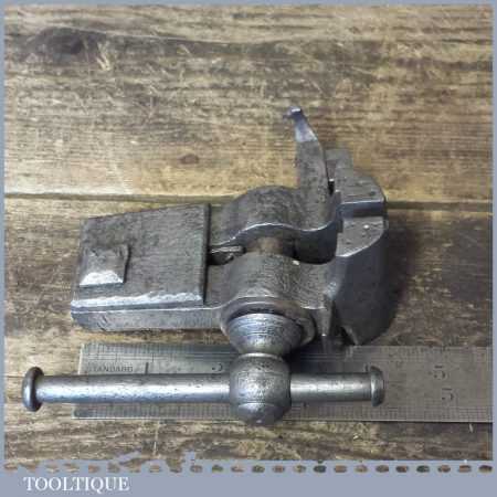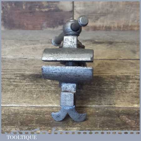 Unusual and rare Antique clock makers or Jewellers vice with a winged bench grip which would have hooked around a pair of pegs rather than a clamp so often seen on others. This is certainly hand made by a blacksmith and has a suggestion in the ornate style to be 18th century. The design is clever as it could be used on or off the bench simply by lifting it off the bench without all the fussy clamp in the hand. I really rate this tool as it is a testament to those highly skilled craftsmen of the past who had nothing more than imagination and skill to craft these type tools.