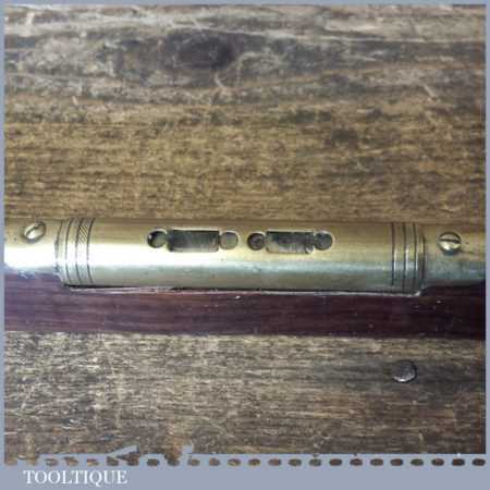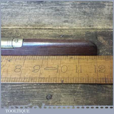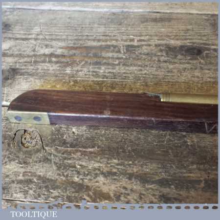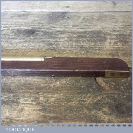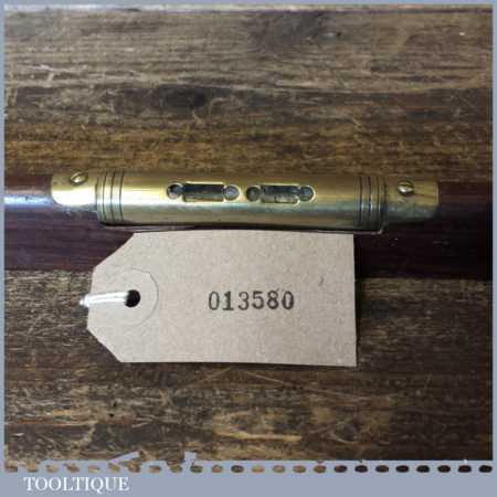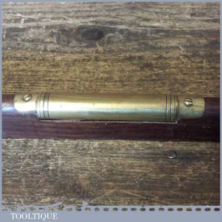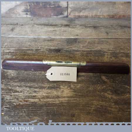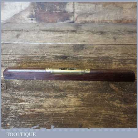 Unusual vintage 12” rosewood and brass spirit level with original clear bubble tube with revolving protective cover, in good used condition. Note: the level hasn’t been tested and may require resetting in putty if intended for use.