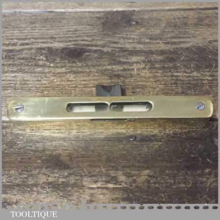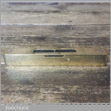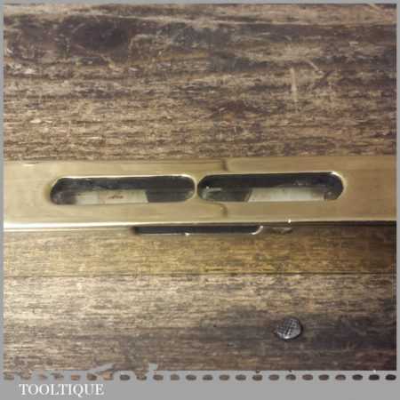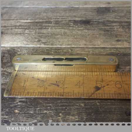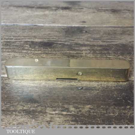Unusual vintage 6” solid brass spirit level with clear glass bubble in good used condition. Note: this has not been tested and may require resetting in putty if you intend using it.