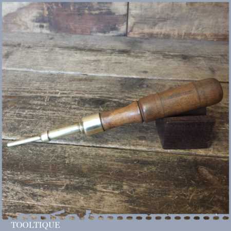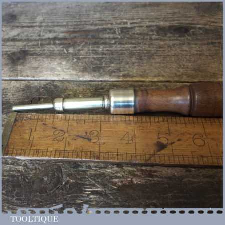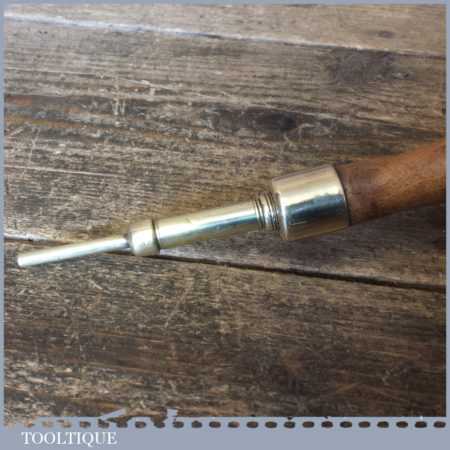 Unusual vintage brass push pin tool with beechwood handle in good used condition.