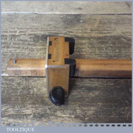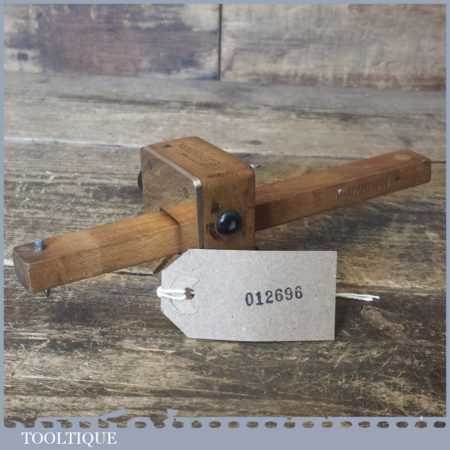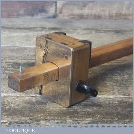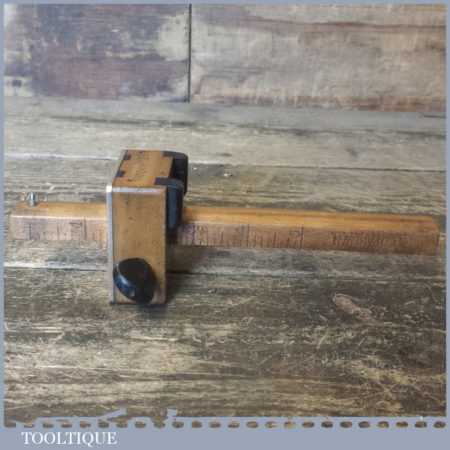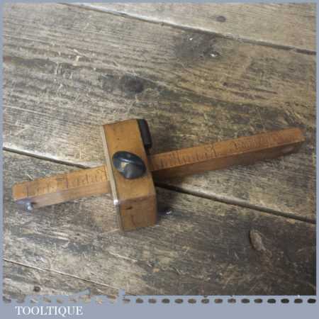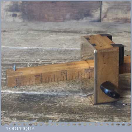 Unusual vintage carpenter’s beechwood and brass calibrated marking gauge with smooth action and good pin, in good used condition. Note: Rosewood inserts for circular work and rosewood thumbscrew, nice tool.