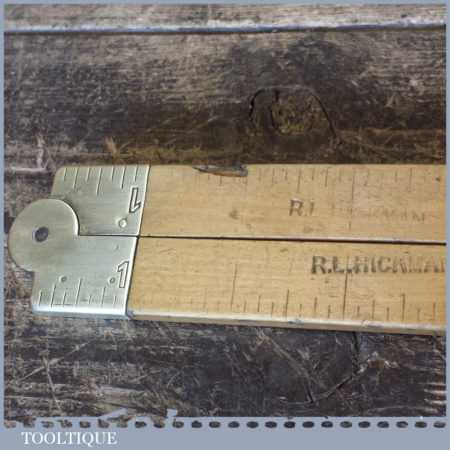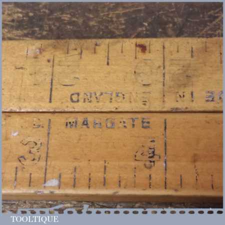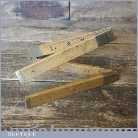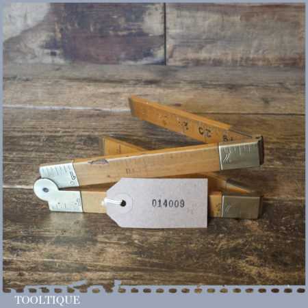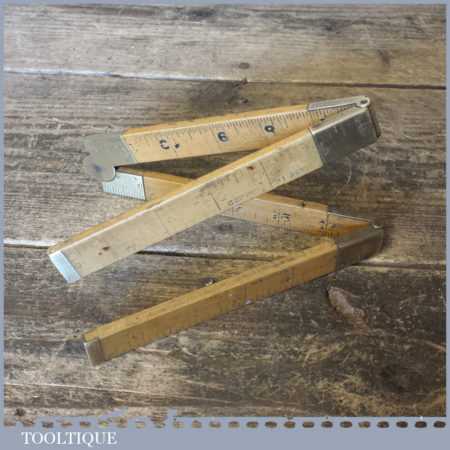 Unusual vintage carpenter’s boxwood and brass 24” folding ruler with heavy brass joints, in fair used condition. Note: Outer markings colour worn but still visible.