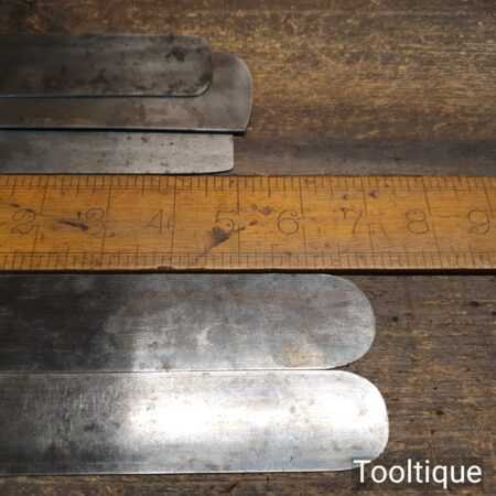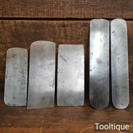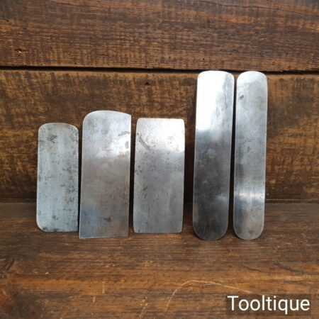 Variety of 5 No: vintage high carbon spring steel shaped cabinet scrapers in good used condition. Note: the edges on these have been dressed for a crisp edge.