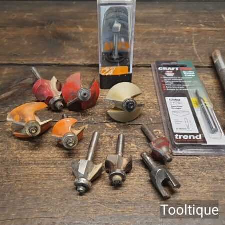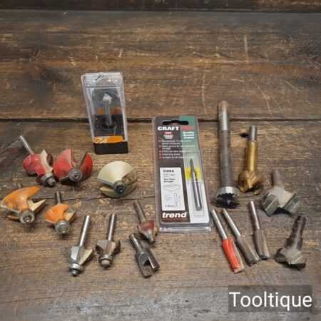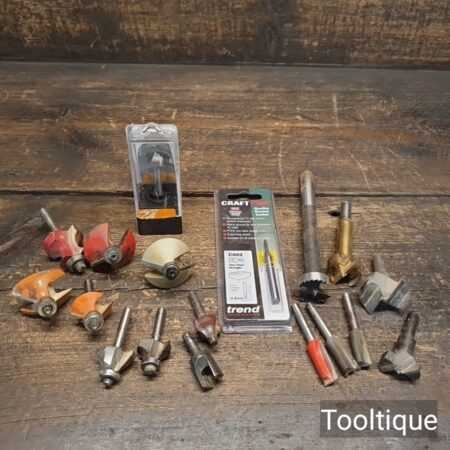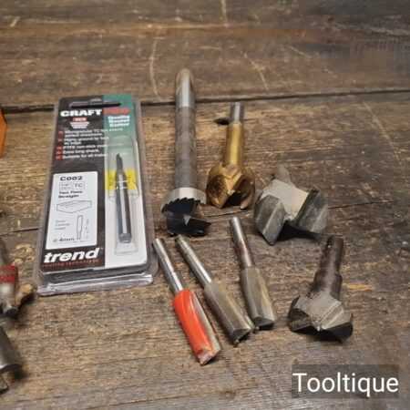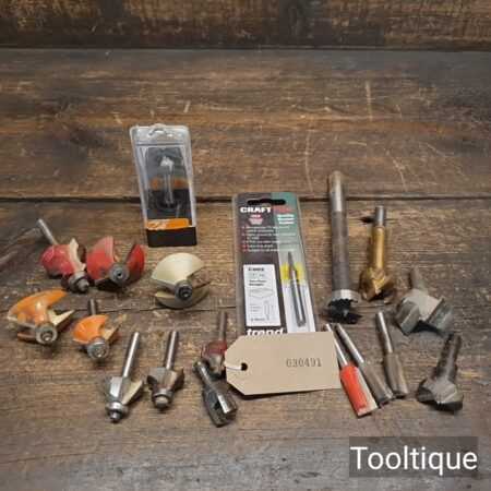 Variety of mixed makers electric router and Forstner bits in good used condition.