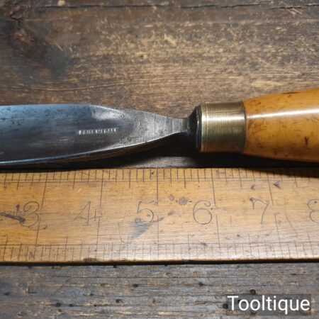 Vintage 1 ⁵⁄₁₆” Herring Bros of London woodcarving Sculpting gouge chisel with boxwood handle in good used condition, fully refurbished sharpened and honed ready for use.