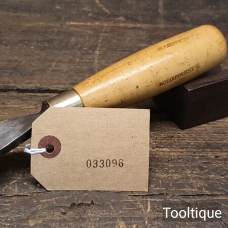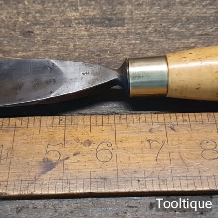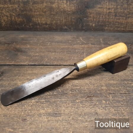 Vintage 1 3/16” Marples & Sons Shamrock Woodcarving Gouge Chisel with a Boxwood Handle in good used condition.