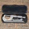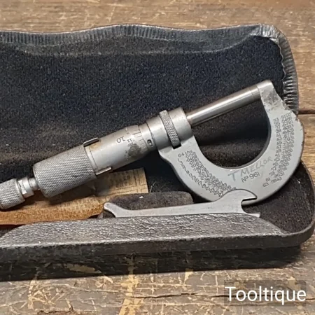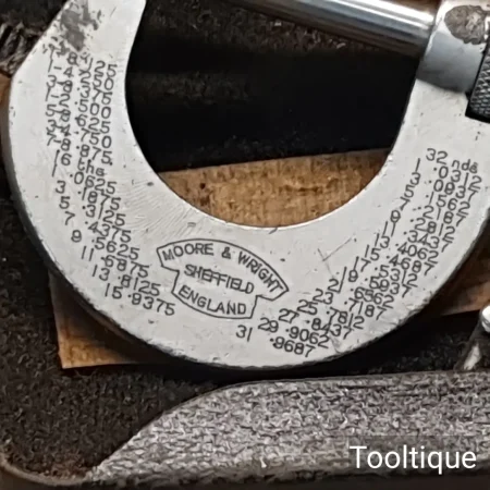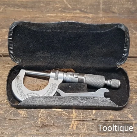 Vintage 1” Moore & Wright Imperial Micrometer in good/fair used condition. Note: Adjusts freely, minor rust spots, see images.