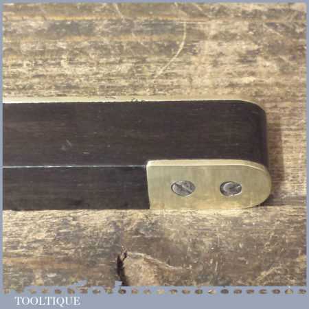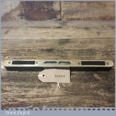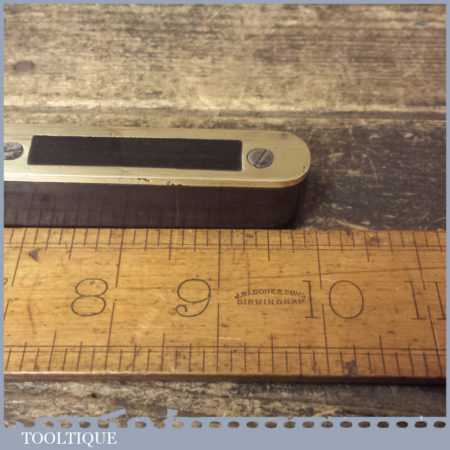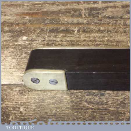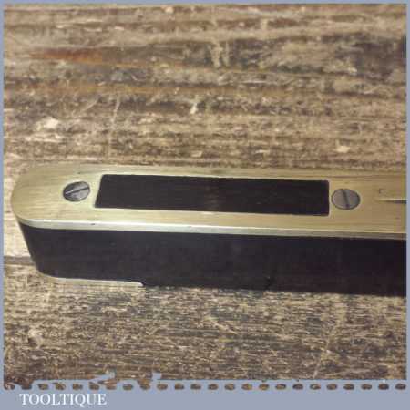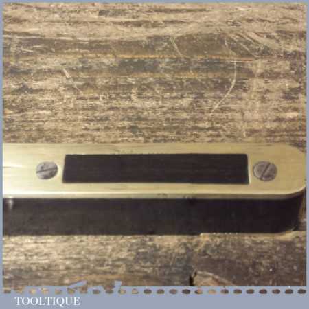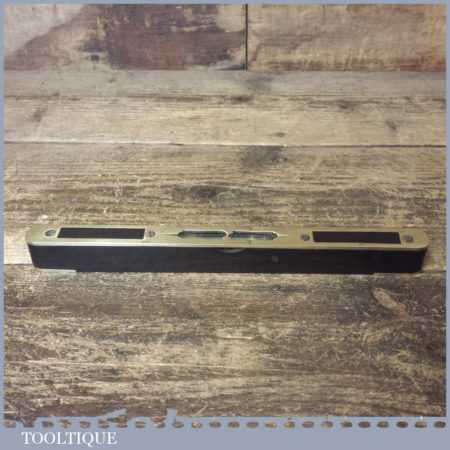 Vintage 10” ebony and brass spirit level with original clear bubble tube in good used condition. Note: the level hasn’t been tested and may require resetting in putty if intended for use.