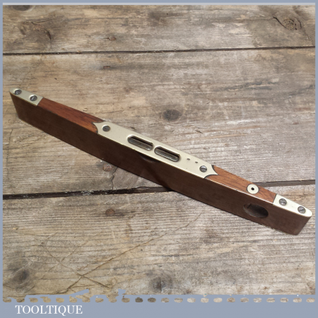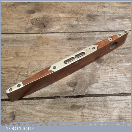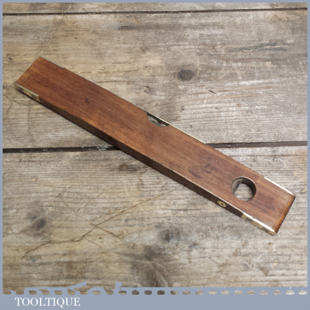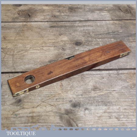 Vintage 10” rosewood and brass boat level with attractive split brass design and vertical side bubble in good used condition. This is a nice early boat level with clear alcohol bubbles. The bubbles may require setting up if you intend using it as I have not tested it.