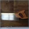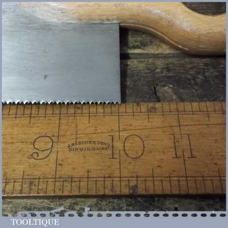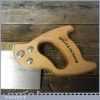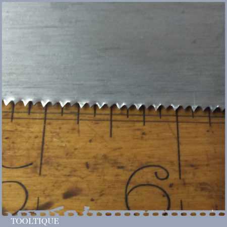 The saw has been thoroughly cleaned, jointed, resharpened and set by hand so that all the hard work of getting an old vintage saw right has been undertaken. We do this so that the next sharpening is easier and no more than a quick freshen up would be required. Those who are familiar with sharpening will know this is no small job and requires skill, effort and time to achieve good results.