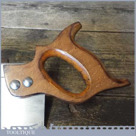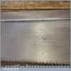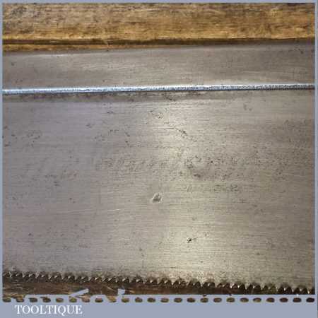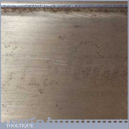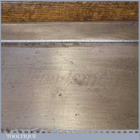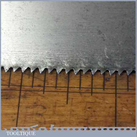 The saw has been thoroughly cleaned, jointed, resharpened and set by hand so that all the hard work of getting an old vintage saw right has been undertaken. We do this so that the next sharpening is easier and no more than a quick freshen up would be required. Those who are familiar with sharpening will know this is no small job and requires skill, effort and time to achieve good results.